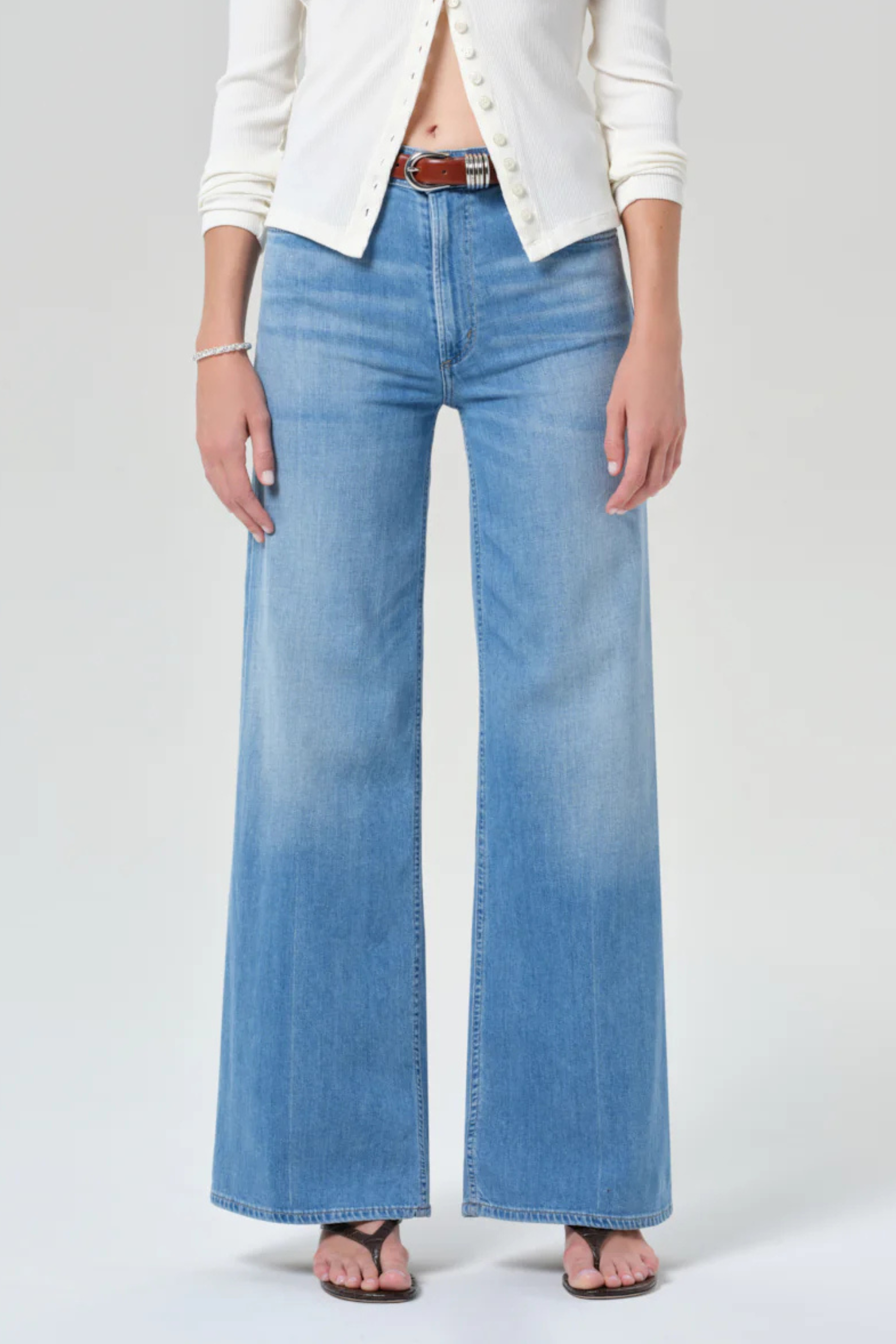High-rise waist and a light blue wash with subtle fading.Wide-leg silhouette that creates a relaxed, effortless look.Comfortable and slightly loose through the hips and legs, perfect for casual styling.