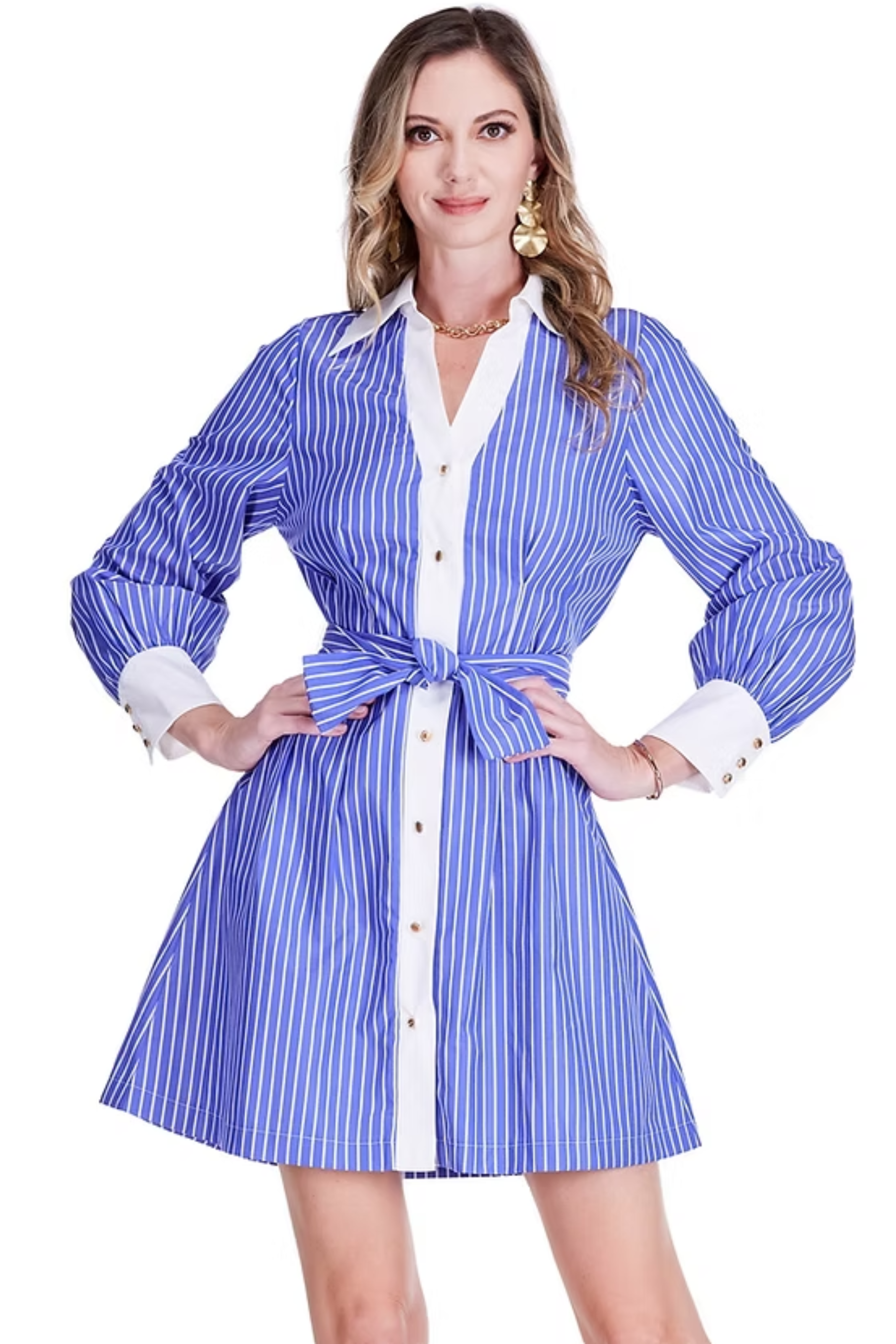 Pinstriped shirt dress with white collar and optional belt