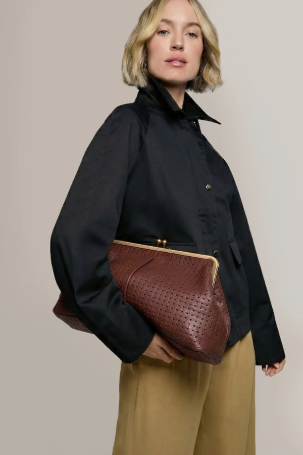 Crafted in our iconic leather, this spacious clutch features a vintage-inspired metal frame and clasp closure, perfect for carrying all your essentials in style. Whether for a night out or an elegant addition to your daytime look, the Grace Oversized Clutch is a statement of refined simplicity.