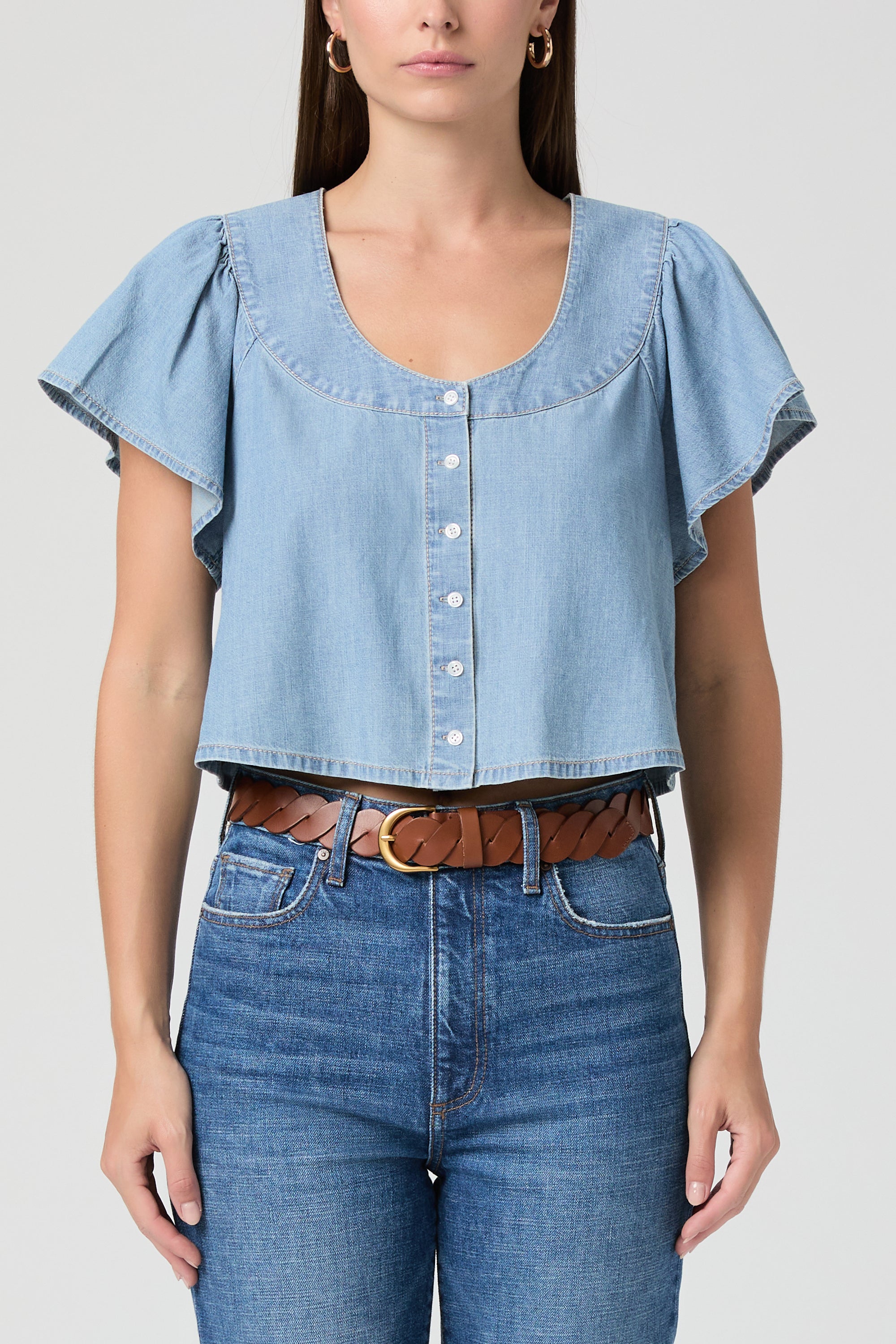 A cropped chambray top with a soft scoop neckline, flutter sleeves, and button-front detail—easy to style, fun to wear, and perfect for warm days.