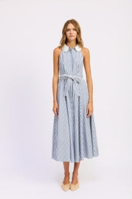 This sleeveless midi dress features classic blue-and-white stripes, a button-front bodice, and a waist-defining tie belt. Finished with a softly flared skirt, it’s a timeless, breezy style perfect for warm days.