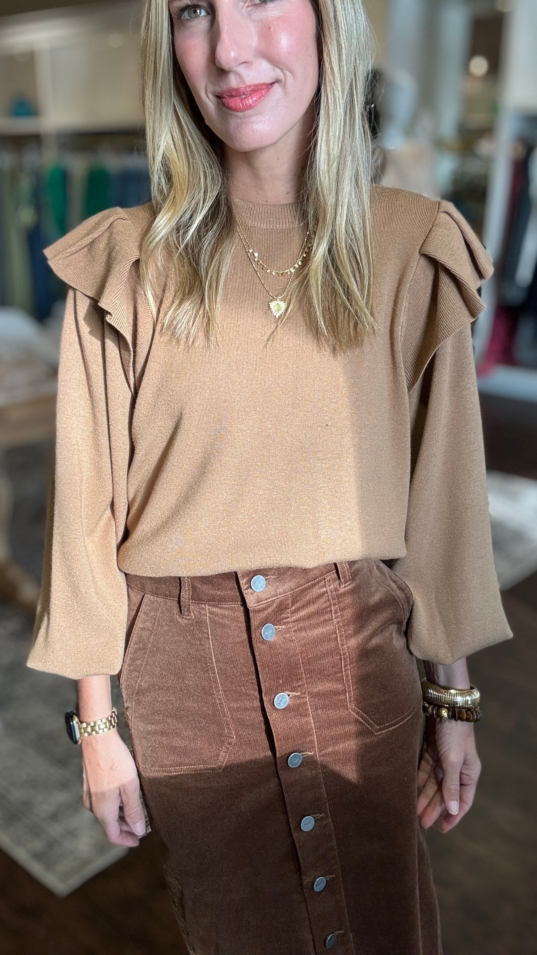 -Ruffle Shoulder Detail -Ribbed Cuff -82% Viscose / 18% Polyester -True to Size -Care Instructions: Dry Clean or Hand Wash with Gentle Detergent and Lay Flat to dry