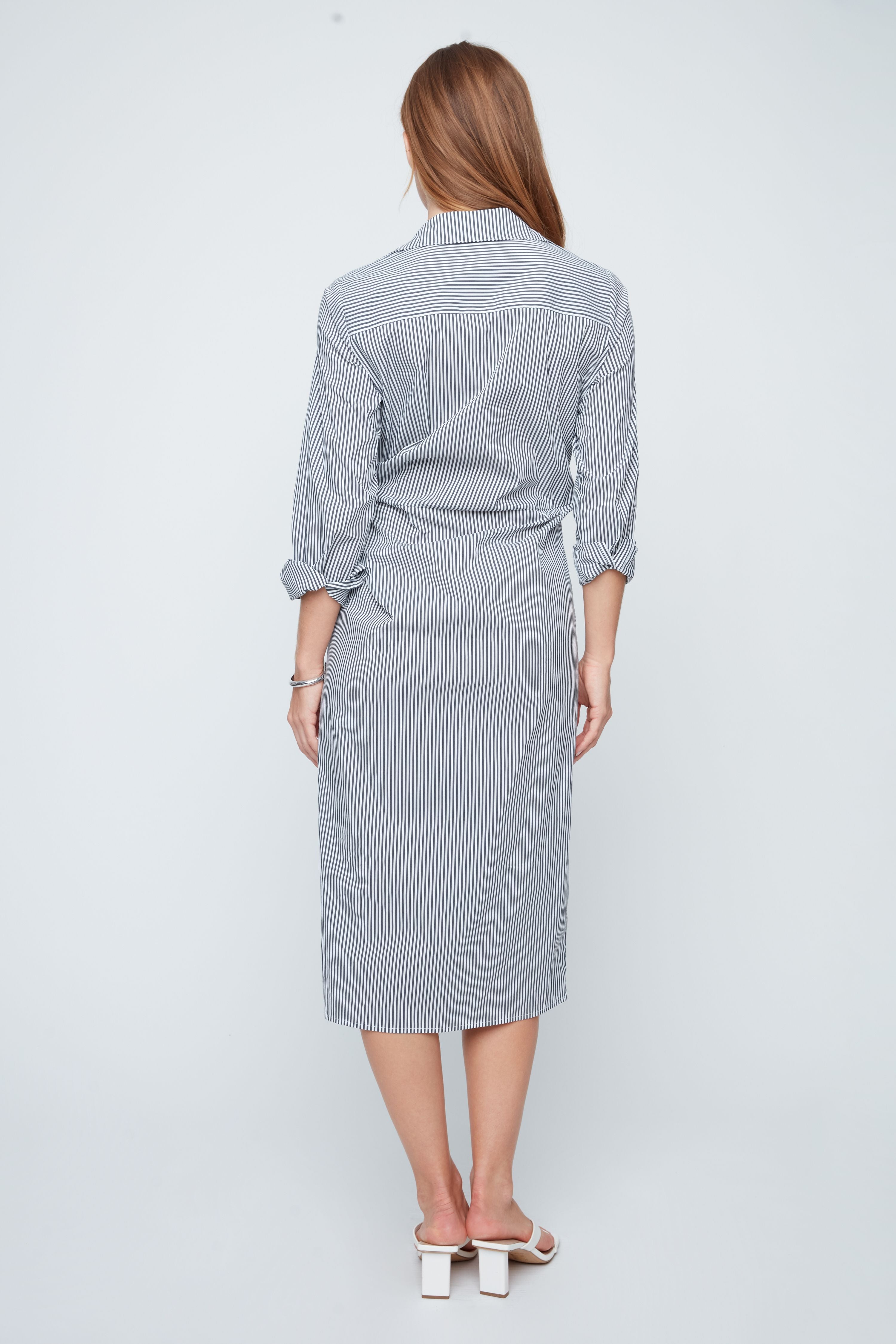 A classic striped wrap-style silhouette with an easy midi length and subtle shaping—effortless, flattering, and ready for workdays, weekends, and everything in between.