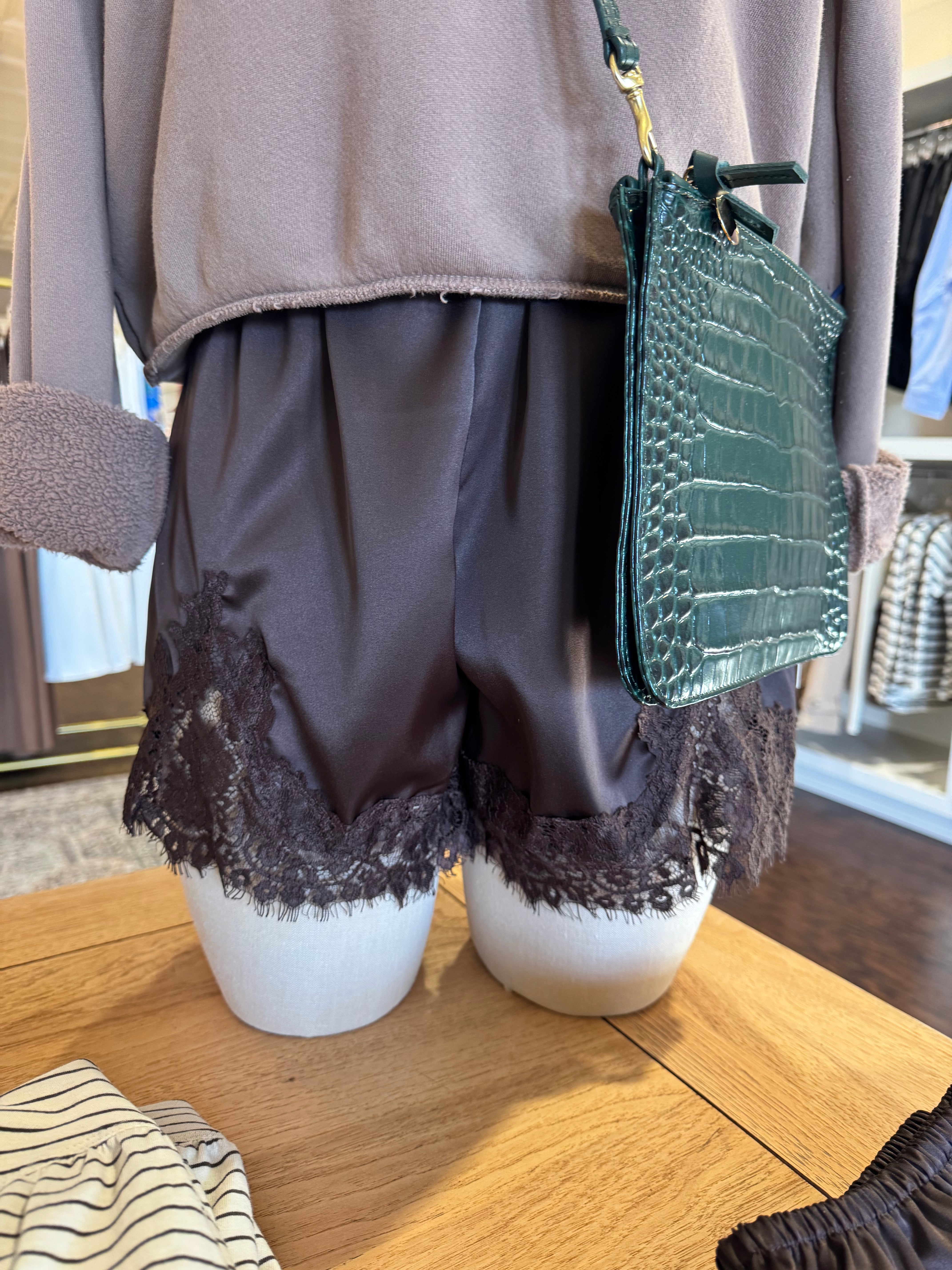 Elastic Waist Satin Shorts With Lace Trim Detailing