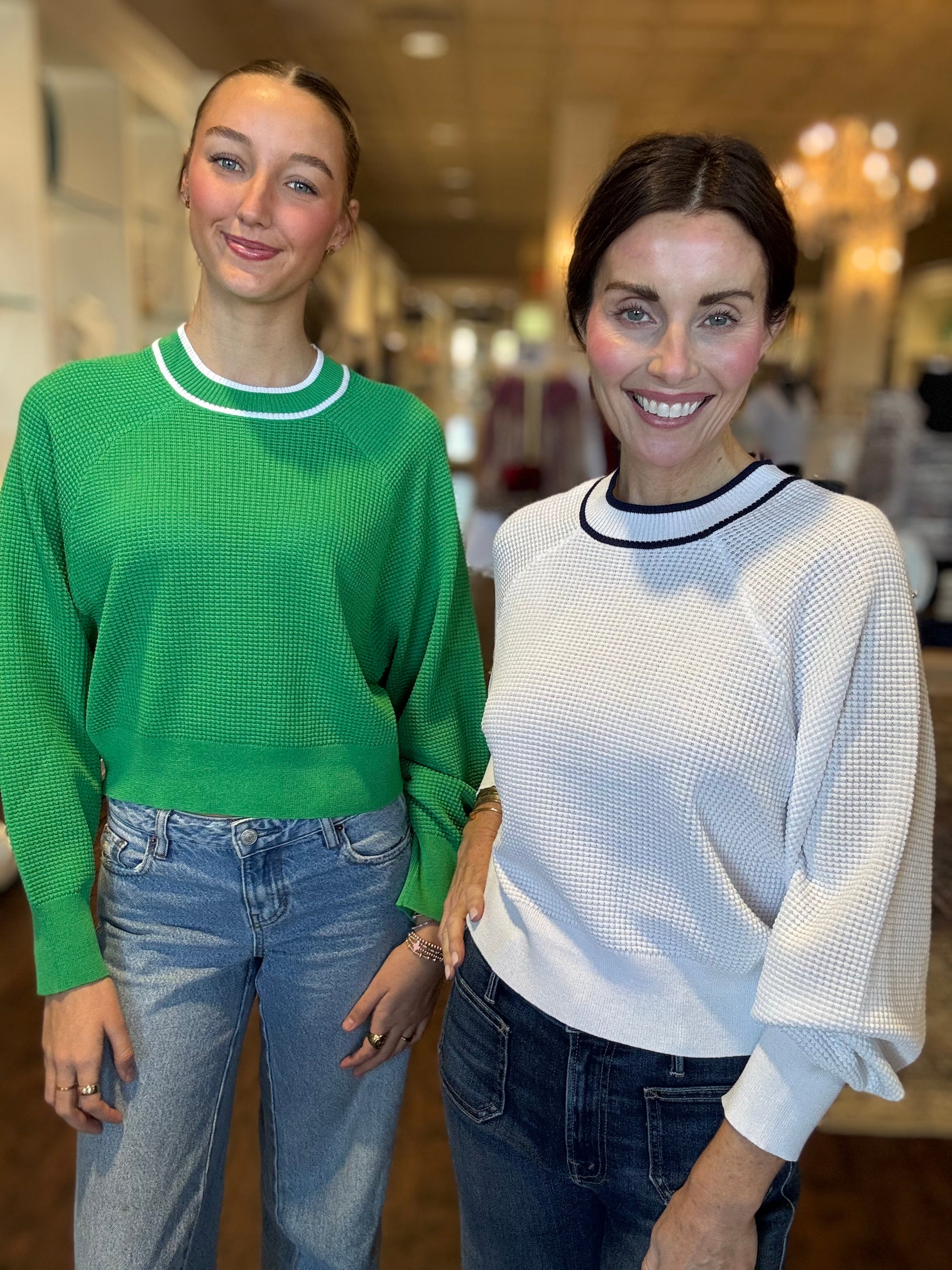 Crew neck long sleeve dolman top in waffle stitch with contrast piping detail